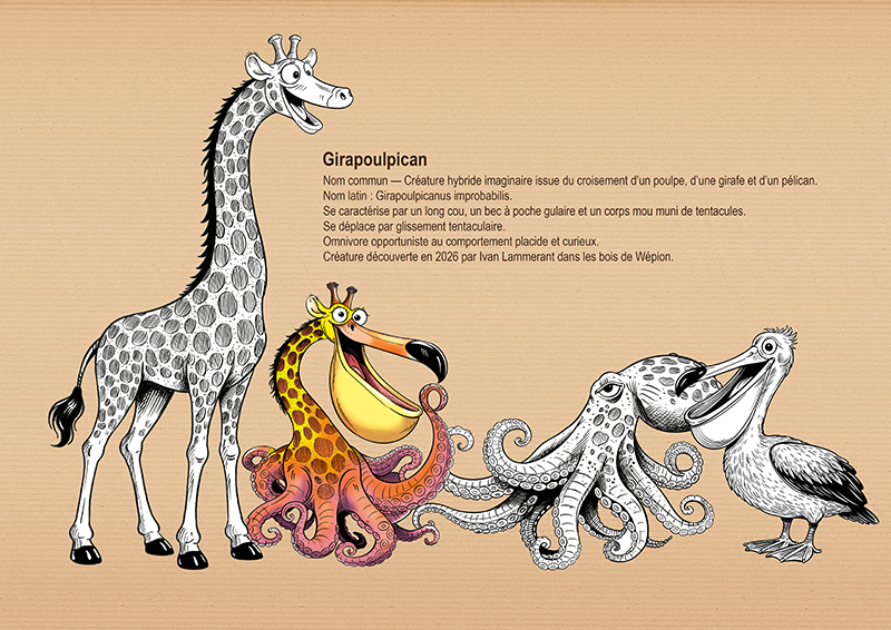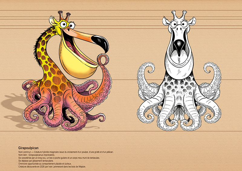 Nom commun — Créature hybride imaginaire issue du croisement d’un poulpe, d’une girafe et d’un pélican.